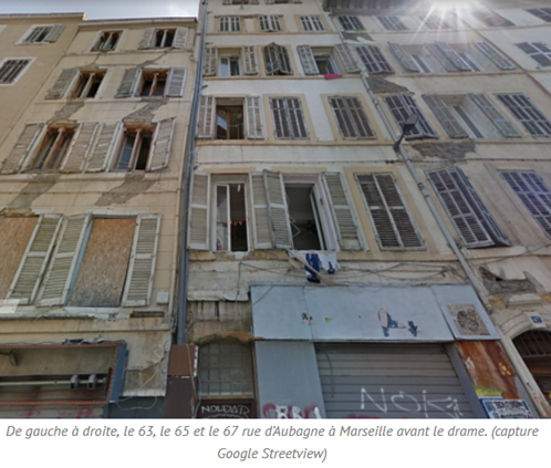 L’effondrement du 5 novembre 2018, rue d’Aubagne à Marseille a touché le n°63 qui était inoccupé, il appartenait depuis 2016 à la société d’économie mixte Marseille Habitat ; le n° 65 était la copropriété habitée dans lequel se trouvaient les victimes.